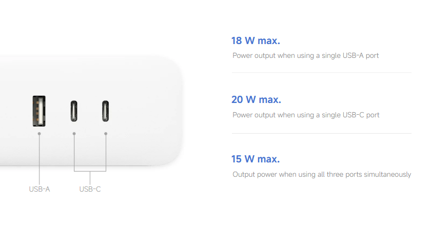 The strip includes three AC outlets rated up to 3,680W, plus two USB-C ports (up to 20W each) and a USB-A port (up to 18W). When only one USB device is connected, it can draw the full rated output. But when multiple devices are plugged in, the 20W total output is shared across the ports.