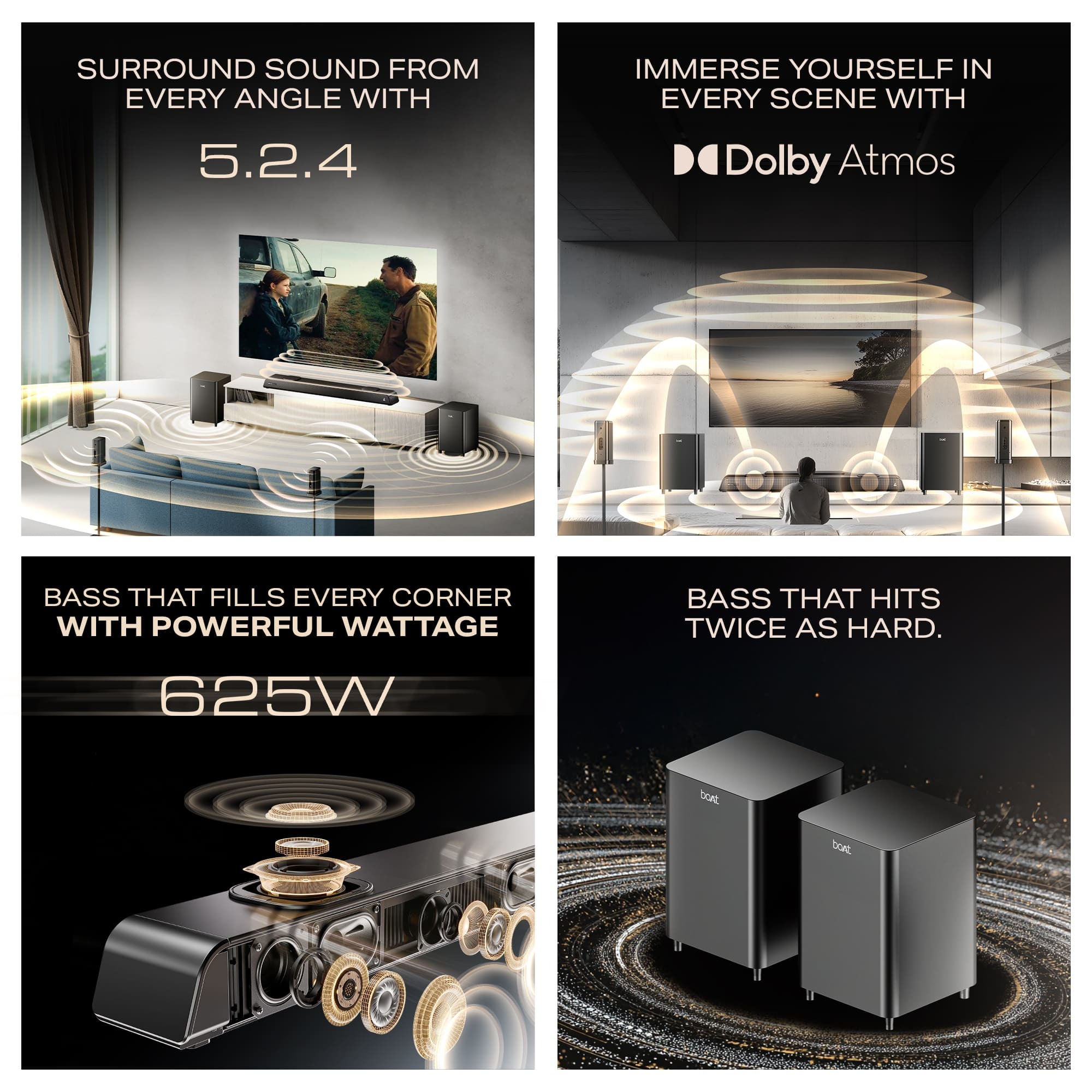 The Aavante Prime 6250DA features a 5.2.4 channel setup with dual wired subwoofers and dual wireless rear satellites. It delivers 625W RMS output with Dolby Atmos and boAt Signature Sound. The soundbar supports multiple input options and includes dedicated modes for movies, music, sports, and news. It has a matte finish design and comes with a remote for control.