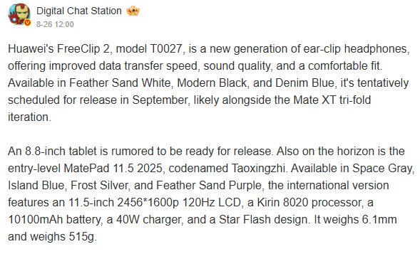 Huawei may be gearing up for a busy September, with reports suggesting the company is preparing to roll out a new version of its ear-clip headphones along with a small but premium tablet. The leaks, coming from familiar tipsters on Weibo, give us an early look at what could be announced alongside the Mate XTs tri-fold phone.