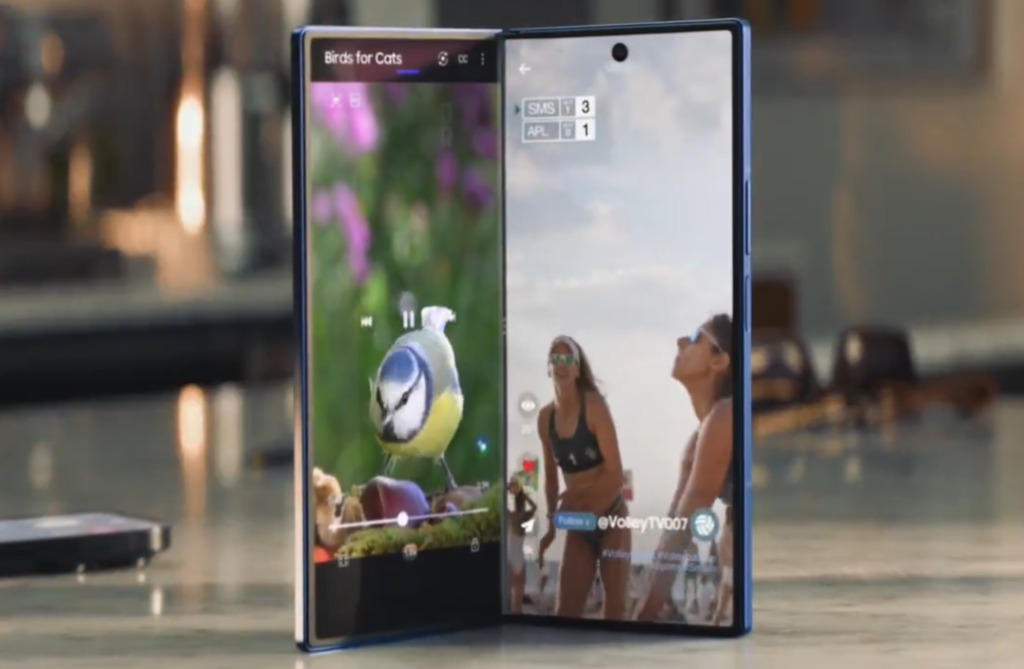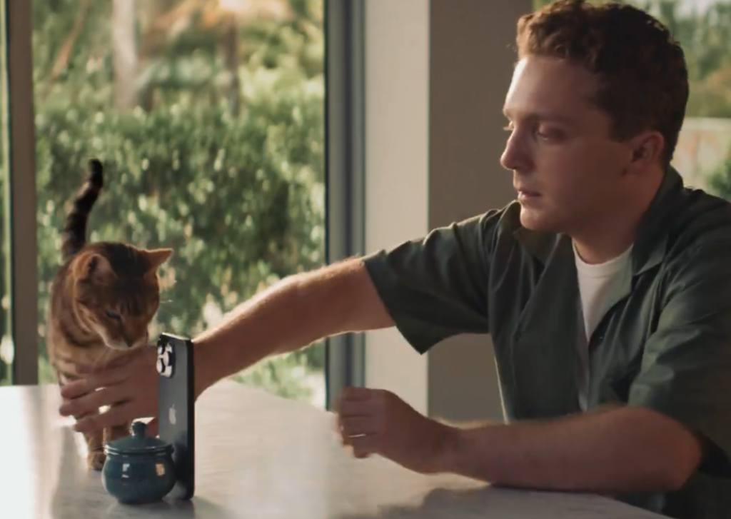 In the 30-second clip, an iPhone user struggles to prop his phone up on a table — maybe to snap a selfie, hop on a video call, or just watch something hands-free. His curious cat makes the task even harder, knocking the device over as he tries to balance it upright. The punchline arrives when a friend casually places a Galaxy Z Fold 7 on the table, folded partway so it stands on its own. The foldable splits the display into two videos running side by side, a multitasking move that no bar-style iPhone can manage. A message flashes on screen: “Can your phone do that?”