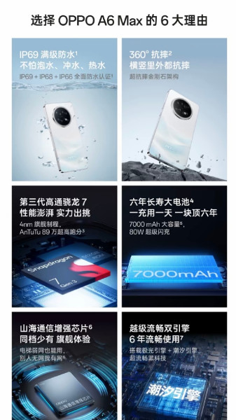 Under the hood, the A6 Max runs on Qualcomm’s Snapdragon 7 Gen 3 chip, paired with 8GB of RAM and 256GB of storage. To keep performance steady, Oppo has added a 5,200mm² vapor chamber for cooling.