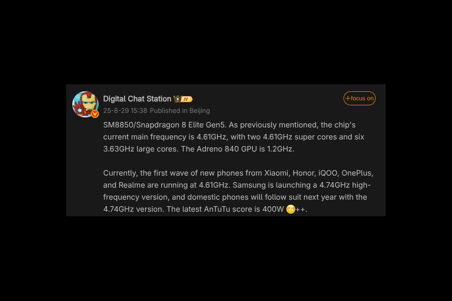 Now, a new leak from tipster Digital Chat Station has revealed more details about the chipset. According to the leak, the chip will feature two prime cores clocked at 4.61GHz, alongside six performance cores running at 3.63GHz. On the graphics side, it will pack an Adreno 840 GPU running at 1.2GHz.
