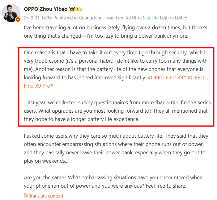 According to Yibao, Oppo conducted a survey last year with more than 5,000 Find X8 series users, asking what upgrades they were looking forward to, and they all mentioned that they hoped to have a longer battery life experience. Keeping in line with people’s requests, Yibao revealed that the Find X9 series will indeed offer significantly improved battery life.