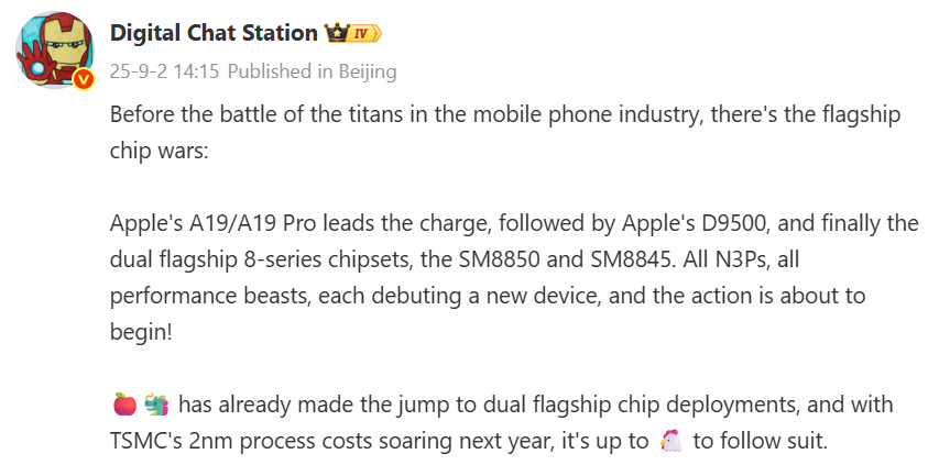 According to reliable tipster Digital Chat Station, the smartphone industry is heading into a major “chip war” before the big wave of flagship phone launches. Apple is leading with the A19 and A19 Pro, followed by MediaTek with the Dimensity 9500, and then vwith two Snapdragon 8 series platforms, the SM8850 and SM8845. These Qualcomm chips are likely to hit the market with respective names such as the Snapdragon 8 Elite Gen 5 (aka. Snapdragon 8 Elite 2) and Snapdragon 8 Gen 5.