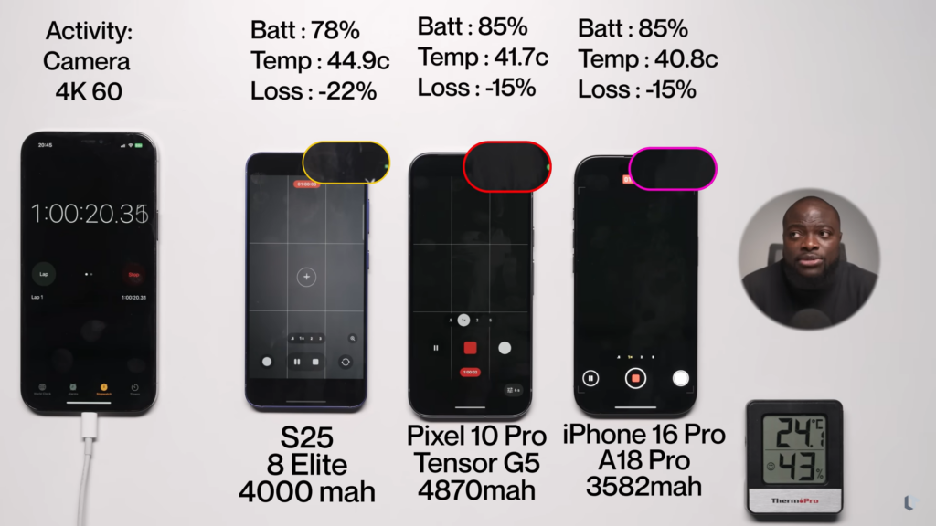 Starting off with one hour of 4K 60fps recording, the Snapdragon 8 Elite-powered Galaxy S25 surprisingly showed the biggest percentage drop and the highest temperature rise. It lost 22% while both the Pixel and the iPhone lost only 15%. The Galaxy also heated up to 44.9°C, compared to 41.7°C on the Pixel—exactly the improvement many creators had hoped Google would deliver. The iPhone stayed a little cooler still at 40.8°C, thanks to Apple’s efficient chip and tight hardware-software integration.