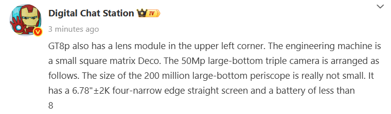 DCS revealed that the Realme GT 8 Pro’s camera setup will comprise a 50-megapixel main camera and a 200-megapixel periscope telephoto camera. While he did not specify the details about the third camera sensor, it could be a 50-megapixel ultra-wide snapper.