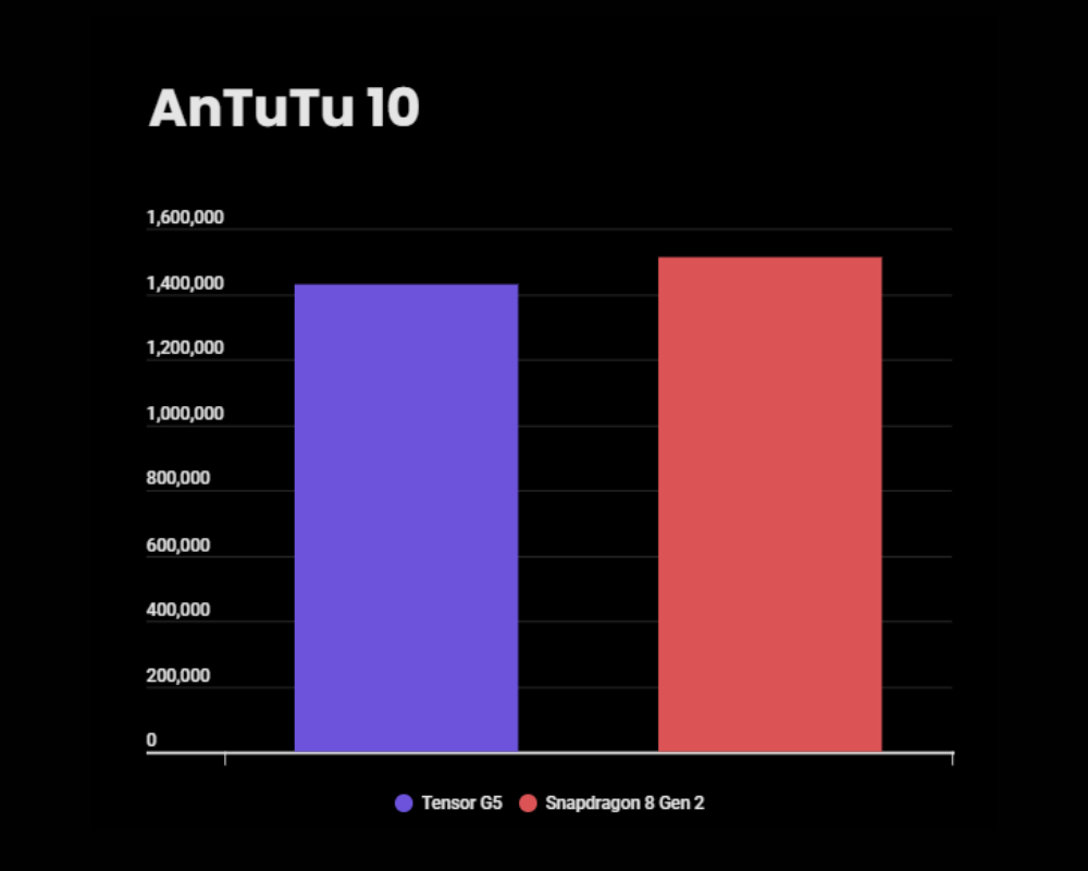 Memory and UX scores are closer, with Tensor G5 slightly ahead in memory (293,467 vs 273,714) and Snapdragon 8 Gen 2 leading in UX (265,325 vs 235,788). So, according to AnTuTu scores, both chips should feel smooth for day-to-day use, but Snapdragon’s stronger GPU still gives it the gaming edge.