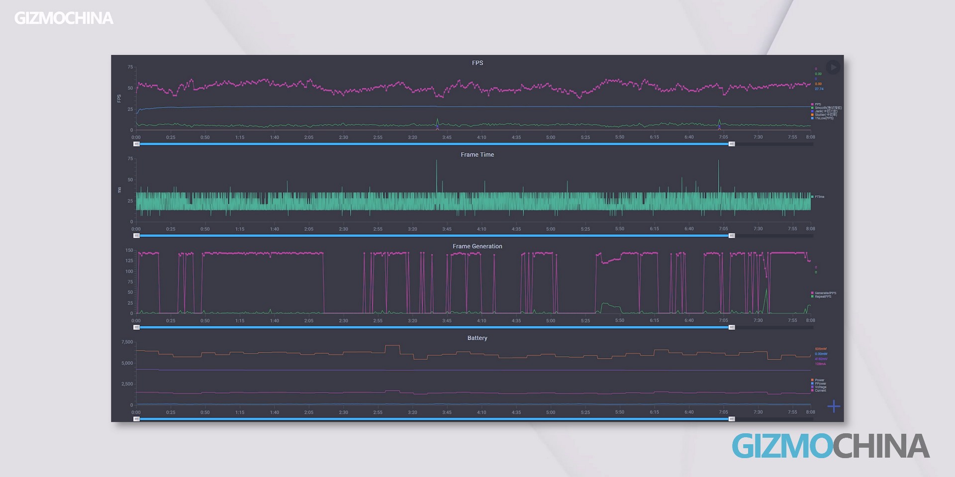 You can see that the Repeat FPS on the realme P4 Pro is very low, with a maximum of only 4fps. This indicates that the X7 Gen2 Visual Processor’s interpolation success rate is very high, meaning you can hardly feel any stuttering. But the prerequisite for achieving this effect is that your graphics quality cannot be set too high. The Snapdragon 7 Gen 4’s performance cannot generate enough frames under higher graphics settings, so when running at high graphics with very complex scenes, the interpolation function may fail.