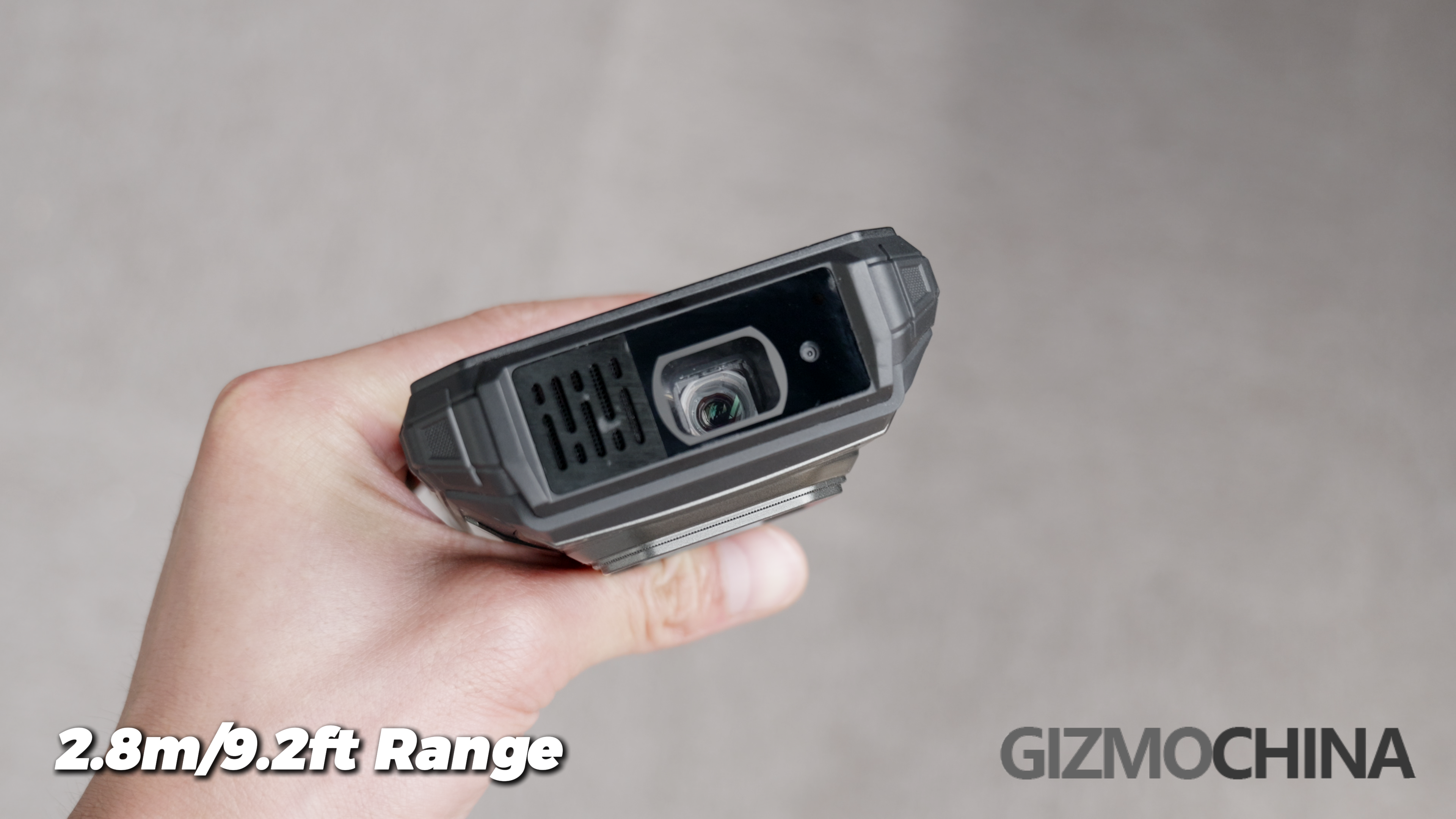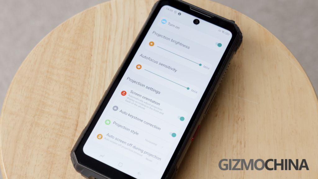 First, let’s talk specs. The projector LED type, it can offer a 480P resolution, with autofocus. And there is a 130dB super loud speaker, for the sound source. To support such a power eater, it has a 20500mAh battery. And there are heat vents next to the beam and the frame of the phone. That’s it, a pocket-size projector/rugged phone.