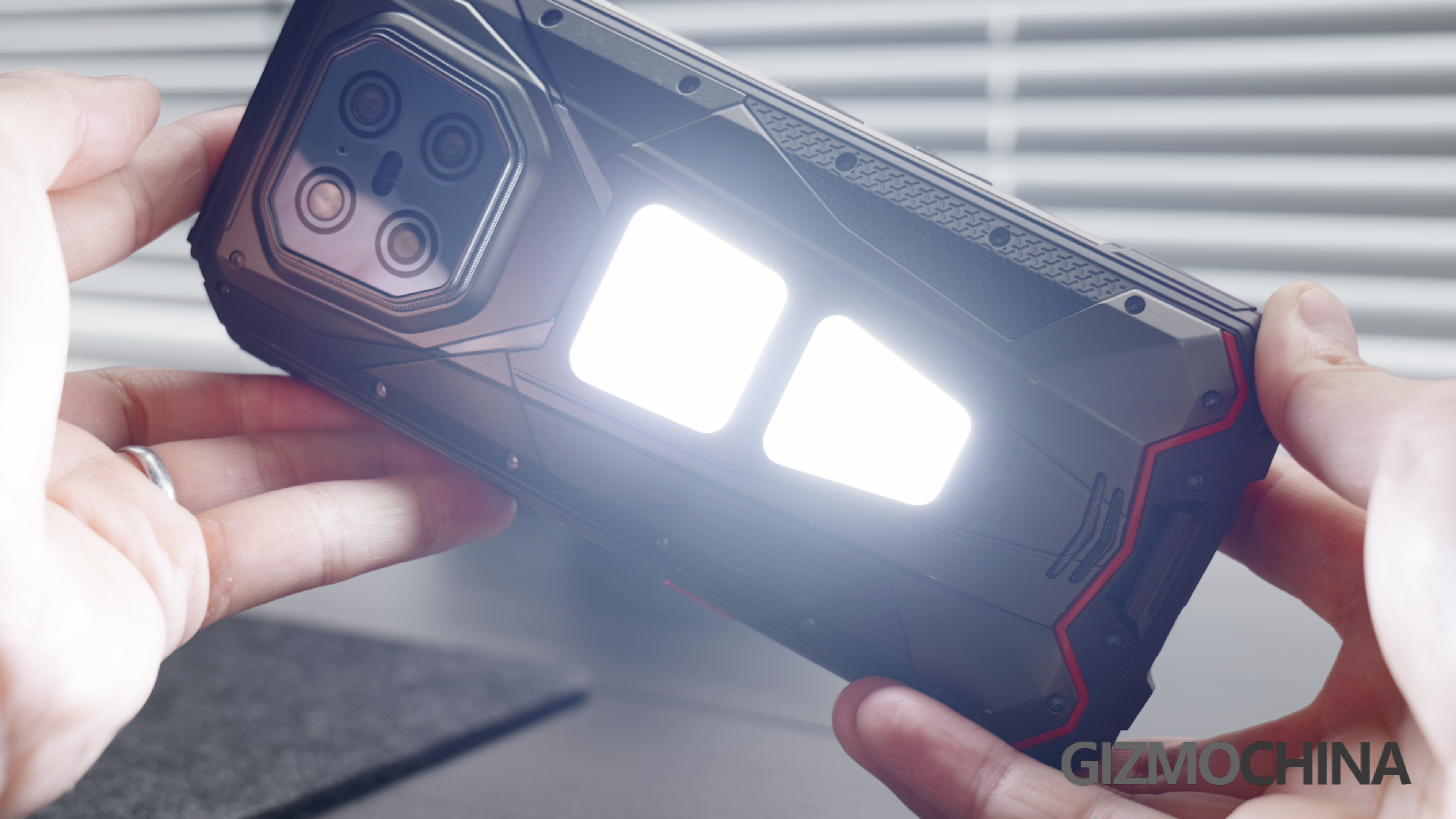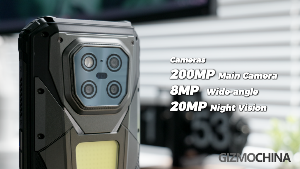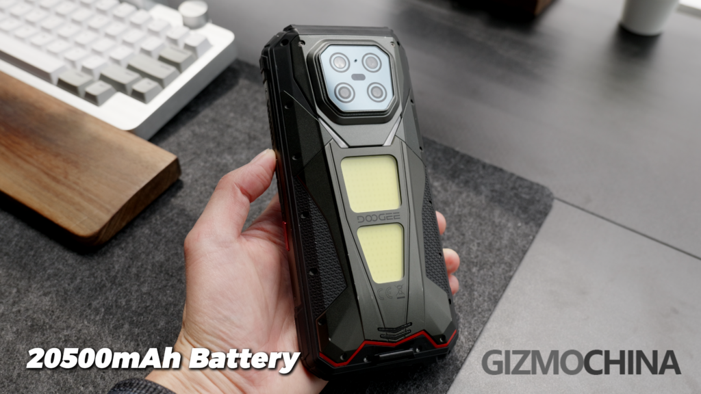 The battery is 20500mAh, which is massive, but it might be consumed faster than other rugged phones, as there are two big consumers here, the projector and the LED light panels.