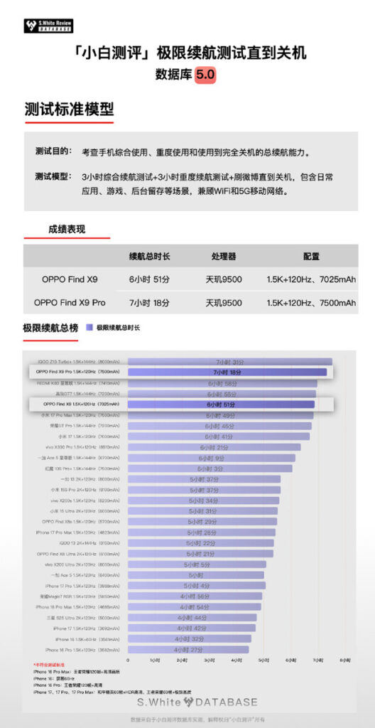 According to results shared by Novice Evaluation, the Find X9 Pro managed 7 hours and 18 minutes in a continuous usage test. That puts it just behind the iQOO Z10 Turbo+ (7 hours 31 minutes, with an 8,000mAh battery) but ahead of Xiaomi’s 17 Pro Max, which clocked 6 hours and 49 minutes. Even the regular Find X9, with its smaller 7,025mAh battery, edged slightly past Xiaomi at 6 hours and 51 minutes. For context, the iPhone 17 Pro Max trailed far behind at 5 hours and 26 minutes — a reminder that Android phones still dominate in raw endurance.