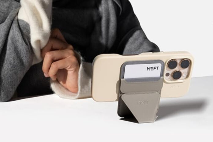 The Moft Snap-On Wallet Stand does exactly that. It doubles as a kickstand. It folds open to prop your iPhone in portrait or landscape mode, perfect for watching videos, video calls, or scrolling hands-free.