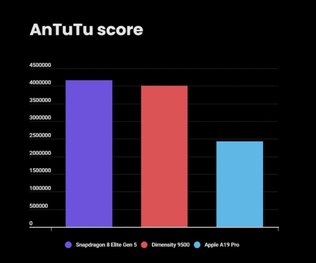 On the AnTuTu v11 platform, the Snapdragon 8 Elite Gen 5 gets about 4.16 million total score. The Dimensity 9500 is a little behind with a 4 million score, while the Apple A19 Pro is nowhere near either of them, scoring about 2.43 million points.