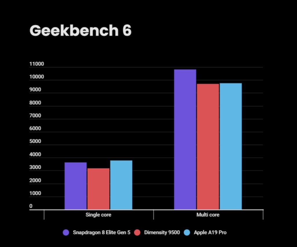 | Geekbench 6 | Snapdragon 8 Elite Gen 5 | Dimensity 9500 | Apple A19 Pro |