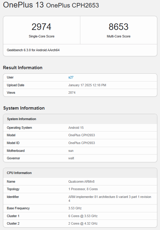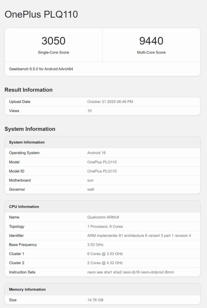 The Ace 6, listed under model number PLQ110, appeared on Geekbench 6 running the Qualcomm Snapdragon 8 Elite chipset—the same processor that powers last year’s flagship, the OnePlus 13. With this chip, the Ace 6 scored 3,050 points in single-core and 9,440 in multi-core tests, which puts it right on the heels of the OnePlus 15, and even slightly ahead of the OnePlus 13’s average multi-core score of 9,369. The small performance difference could also be due to pre-release software, and not necessarily due to any hardware limitations.