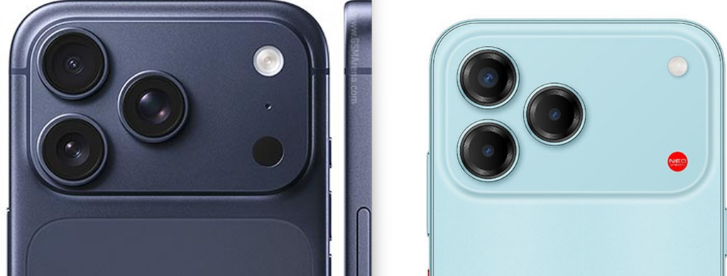 The render comes from Evan Blass (@evleaks), and the resemblance is hard to miss. The Blade V80 Vita uses a full-width camera island with three cameras and an LED flash pushed to the far-right side, almost exactly where Apple is placing the component on the 17 Pro Max. Since this is already plenty of camera hardware for a budget phone, a circular Neo branding occupies the spot where the LiDAR scanner sits on the latest Pro iPhones.