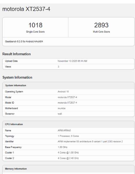According to the listing, the Moto G76 5G scored 1018 points in the single-core test and 2893 points in the multi-core test. Those numbers place it comfortably in the mid-tier zone.