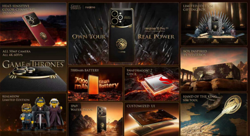 This Limited Edition arrives in an elaborate collector’s box that transforms into a miniature Iron Throne stand. Realme also includes themed collectibles, such as a Hand of the King pin, Westeros map, exclusive postcards, and UV-reactive secret letters, making it an immersive, fan-worthy treasure. While the phone shares hardware with the standard version, the packaging and presentation elevate the experience into a true collectible item.