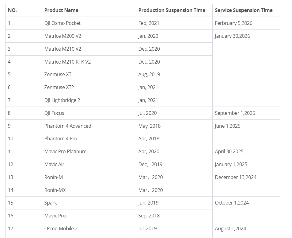 Next up: DJI’s enterprise lineup. The Matrice 200 V2 series — including the M200 V2, M210 V2, and M210 RTK V2 — will no longer be eligible for repairs or updates after the end of January 2026. DJI is warning owners to check their exact model so they’re not caught off guard.