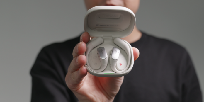 I won’t make you hear all the stuff about the design anymore, we have talked about earbuds quite enough. Basically they are well-made, if not better than all those open-earbuds out there. The shape, you must have seen similar ones. The materials, either flexible and also skin-friendly. Touch controls on the logo here. One thing to keep in mind though, there is a metal plate with the logo on the case. It can add some aesthetic to the product, but be careful not to put it in the same place as your phone or something delicate, or it will do a bit of damage to other things.