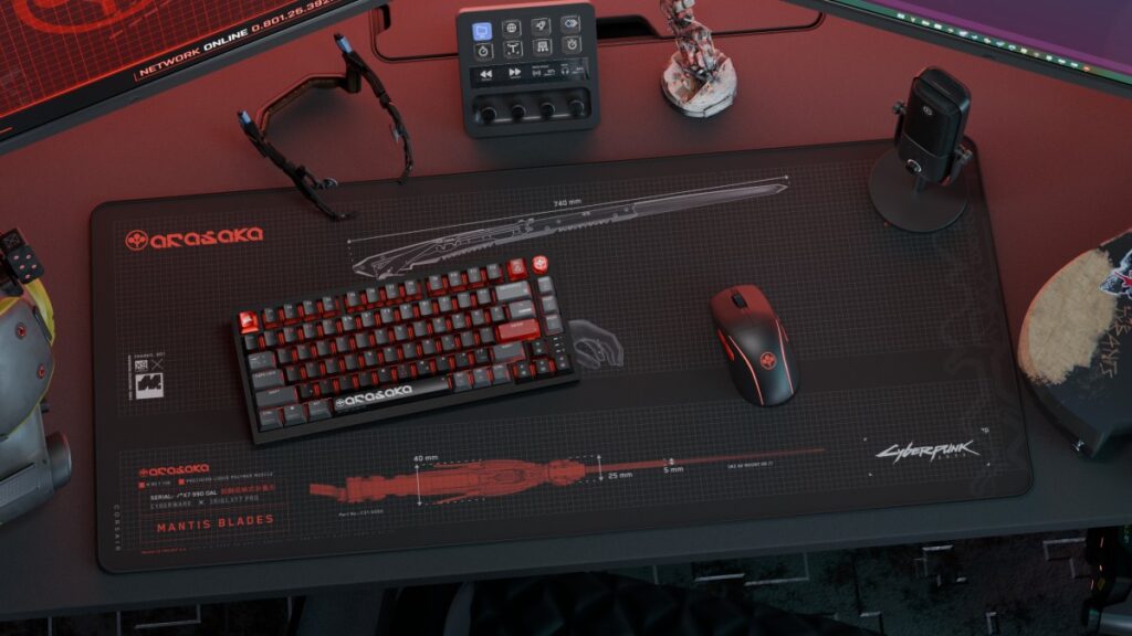 Rounding out the lineup is the MM300 2XL Anti Fray Cloth Gaming Mouse Pad. It covers a large desk area and features detailed schematics of Arasaka’s Mantis Blade cyberware.