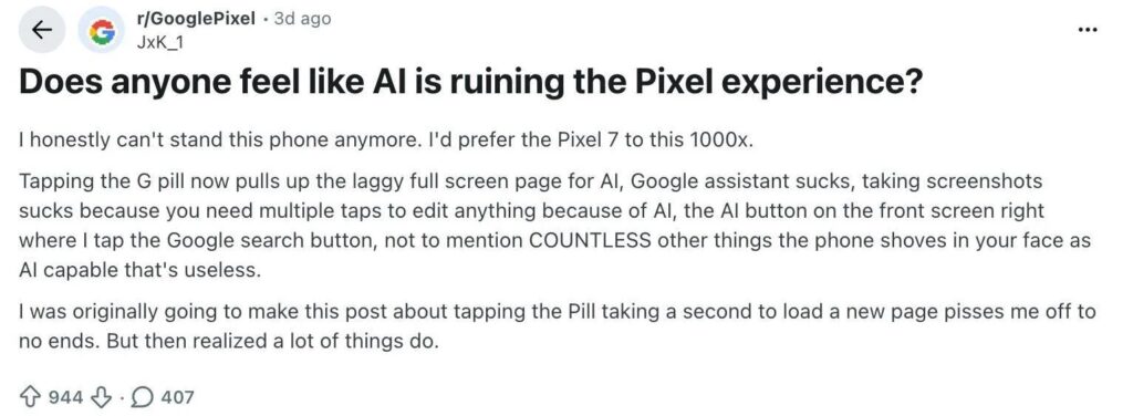 The discussion gained traction after a Reddit user, JxK_1, shared concerns about what they described as unnecessary layers of complexity added through AI tools. The user said they preferred using an older Pixel 7, citing its simpler interface and fewer interruptions.