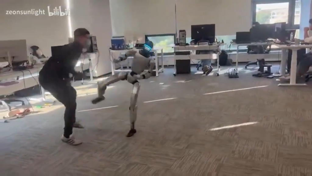 Things are going smoothly at first. The trainer throws a few punches and kicks, and the G1 follows along without issue. But during one sequence, the robot appears to misjudge a rotation and delivers a kick straight into the trainer’s groin.