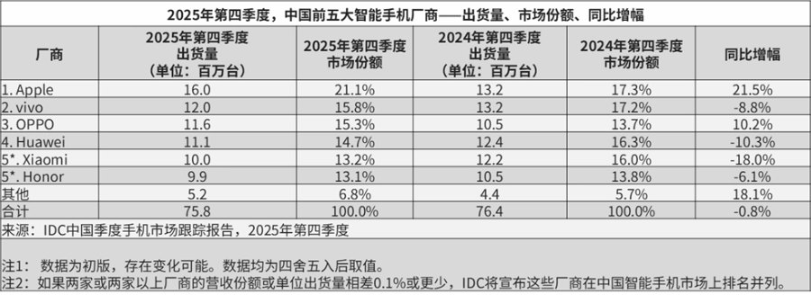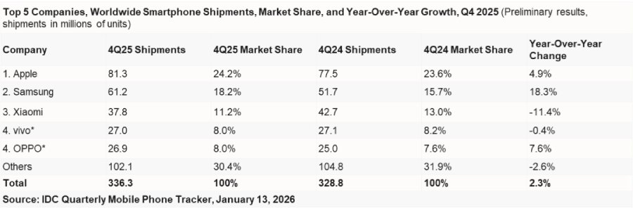 The global market, on the other hand, saw a modest but consistent growth. In the fourth quarter, the shipment volume reached 336.3 million units, up 2.3% year-on-year. Meanwhile, in the whole of 2025, global shipments totaled 1.26 billion units, which is a 1.9% increase.