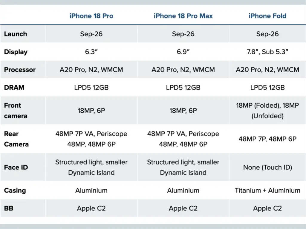 On the hardware side, all three high-end models are said to feature 12GB of LPDDR5 RAM and Apple’s next-generation A20 Pro chip, reportedly built on a 2nm process. They are also expected to use Apple’s in-house C2 modem, marking a further shift away from third-party connectivity solutions.
