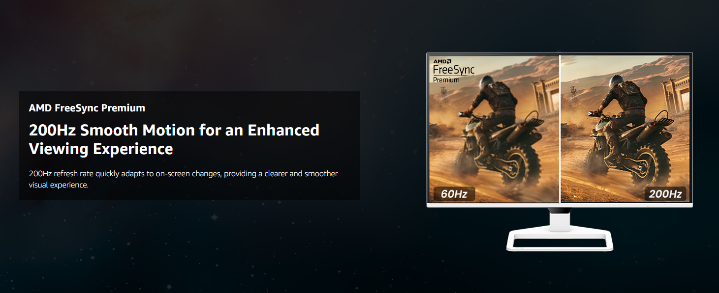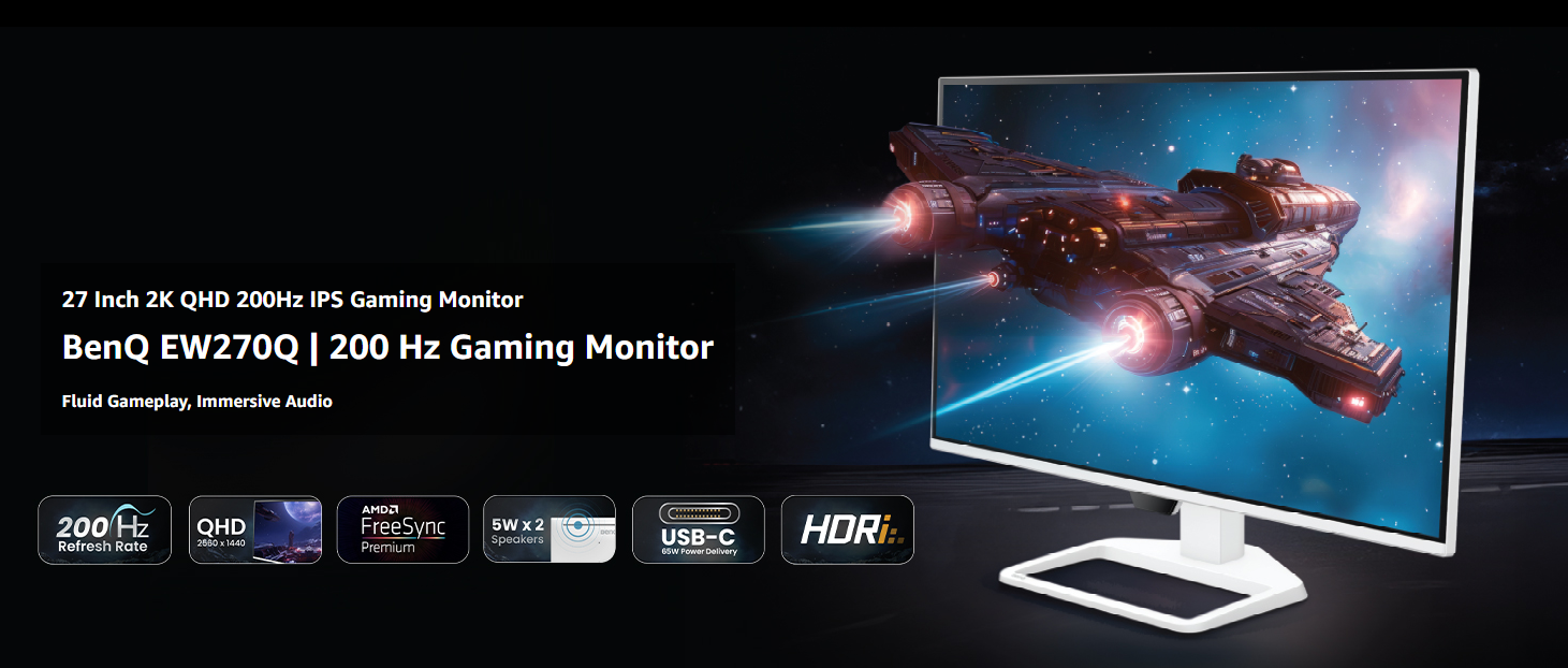 The BenQ EW270Q features a 27-inch IPS panel with a QHD resolution of 2560 × 1440 pixels and a 16:9 aspect ratio. It supports a 200Hz refresh rate and a 1ms response time, which helps deliver smooth motion in fast-paced games. AMD FreeSync Premium is included to reduce screen tearing and stuttering during gameplay. The panel also supports HDR10 and uses a matte screen finish to cut down reflections.