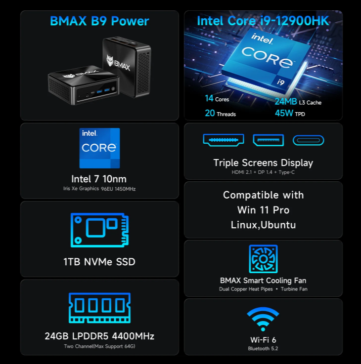 The B9 Power is also designed for productivity-focused setups. Support for triple 4K displays via HDMI, DisplayPort, and USB-C allows users to build efficient multi-screen workstations for trading, content creation, or professional office environments. Modern connectivity options, including Wi-Fi 6 and Bluetooth 5.2, ensure stable wireless performance and compatibility with current peripherals.