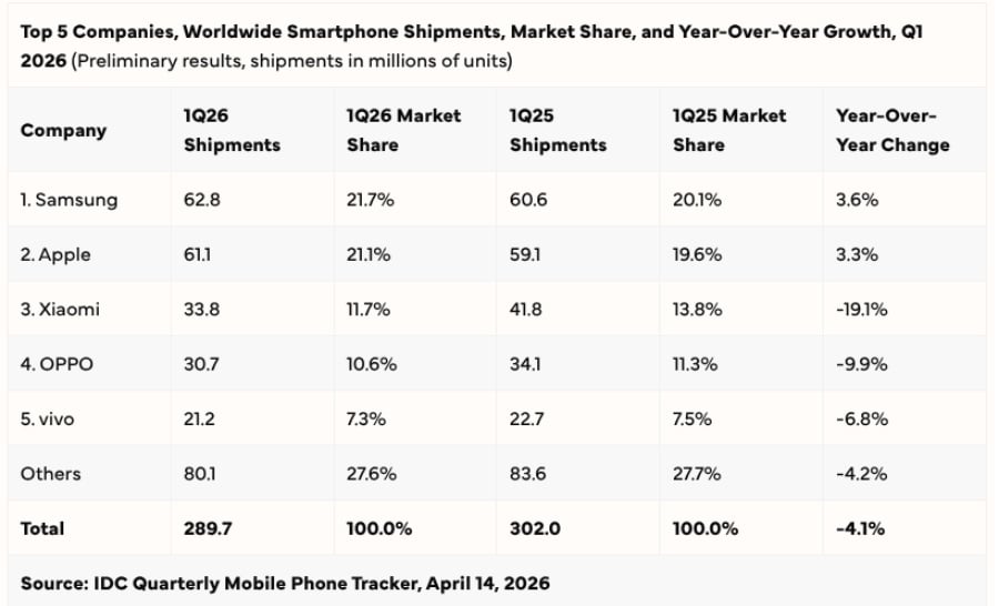 Global smartphone shipments are off to a slower start in 2026. According to IDC’s latest Worldwide Quarterly Mobile Phone Tracker, shipments fell 4.1% year over year in the first quarter to 289.7 million units.