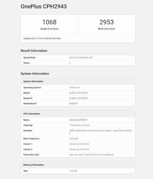 With this setup, the OnePlus Nord CE 6 Lite managed to score 1,068 points in single-core and 2,953 points in multi-core tests.