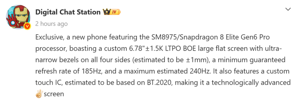 The display is also tipped to offer a very high refresh rate, with 185Hz said to be the minimum target, while the company is reportedly evaluating support for up to 240Hz. The leak further claims that the phone may use a custom touch control IC and could support the BT.2020 color gamut. The tipster describes the panel as a “full-package flagship display” in terms of technology and specifications.