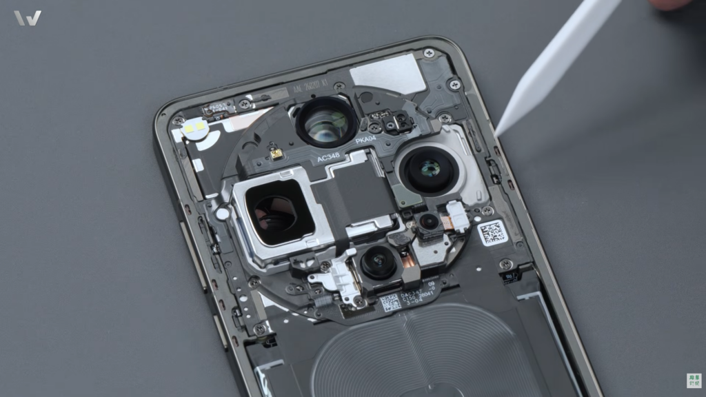Once the eco-leather back panel is removed, the teardown offers a clearer look at the camera layout from the inside. It’s interesting to see how Oppo has managed to fit four lenses into that circular module, including two chunky periscope telephoto units (3x and 10x). The two cameras in the middle are the 3x periscope on the left and the main sensor on the right, while the 10x periscope sits at the top. The ultrawide camera at the bottom looks tiny in comparison to the rest of the hardware.
