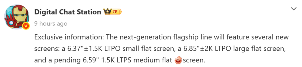 According to a new leak shared by tipster Digital Chat Station, Vivo could introduce three different display sizes for the X500 lineup this year. The leak mentions a 6.37-inch 1.5K flat display with LTPO technology, a larger 6.85-inch 2K LTPO flat panel, and a 6.59-inch 1.5K LTPS flat display that is reportedly still under evaluation.