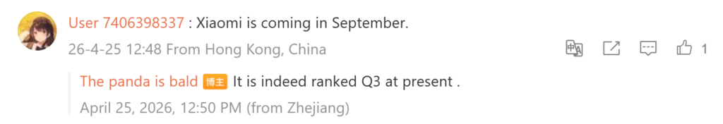In the comments section of the Weibo post, Bald Panda further hinted that Xiaomi’s upcoming foldable is currently scheduled for a Q3 launch timeline. Since the Xiaomi 18 series is expected in September, it is likely that the foldable phone may debut in July.