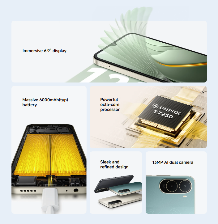 The phone is built around the Unisoc T7250 chipset, which is fine for basic tasks like messaging, streaming, and light gaming. Performance should feel familiar if you have used older budget chips like the Snapdragon 680 or Helio G85. Memory is limited to 4GB of RAM, but storage options go up to 256GB. There is also support for microSD expansion.