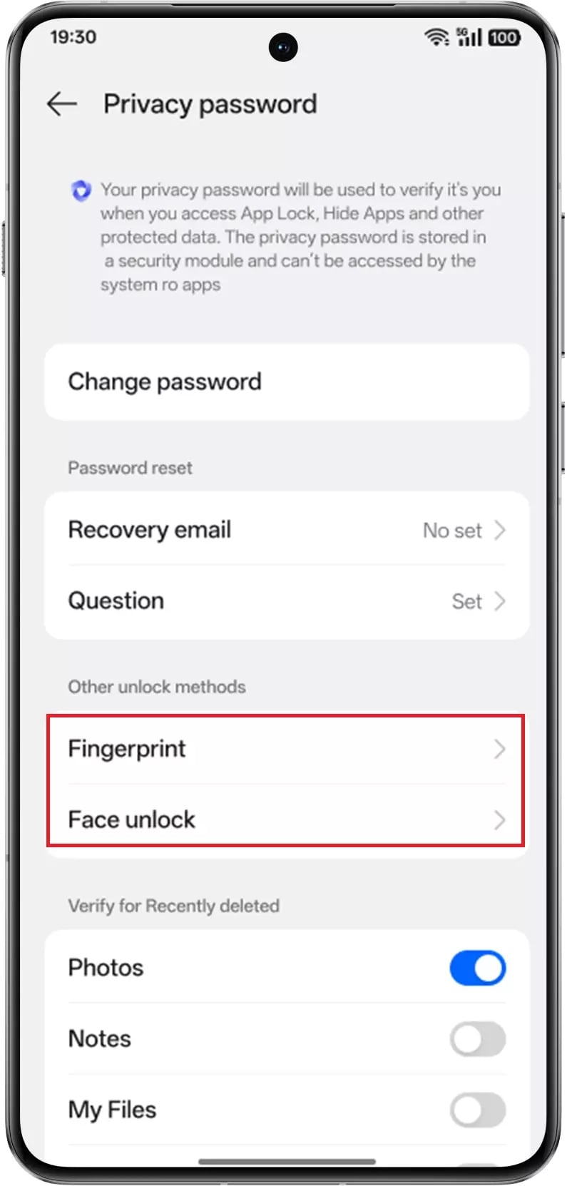 To enable biometric access, users need to open Private Safe, tap the three-dot menu in the top-right corner, go to Settings > Privacy password > Other unlock methods, and turn on fingerprint or face unlock, depending on the option they prefer.